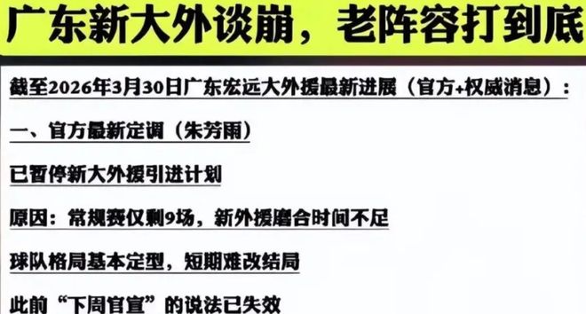 广东男篮本赛季高开低走,虽然说目前还排在联盟第三名的位置上面,但是整体的实力和状态可以看出来是比较差的,对抗强队的时候自身内线的弱点就会被无限的放大,此前对阵上海和北京队的比赛时就非常的明显,此前朱芳雨一直都是说着广东男篮将会迎来新的大外援,但是据相关媒体报道,广东男篮的大外援被长三角地区的球队截胡了,目前对于广东队来说没有心仪的大外援人选,这也是非常糟糕的一件事,目前焦泊乔离队,大外援也不到位,这对于广东队来说真的是双重打击,常规赛还有9轮大外援还没敲定的话对于后续磨合难度非常大,所以大概率本赛季广东队不会有大外援的到来了!