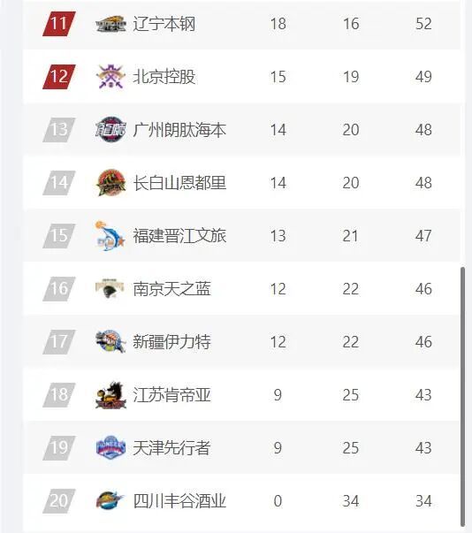 排名第13-20的球队分别是广州龙狮队、吉林队、福建队、南京同曦队、新疆队、江苏队、天津队和四川队。其中广州龙狮队和吉林队都是14胜20负,和北控男篮只差1个胜场,接下来有反超进入季后赛的可能;13胜21负的福建队,12胜22负的南京同曦队和新疆队,以及后面的江苏队、天津队等,想要进入季后赛只存在理论上的可能。四川队本赛季至今0胜34负,是本赛季第一支确定无缘季后赛的球队,CBA从2027年开启升降级模式,四川队很有可能成为第一支被降级的球队。
