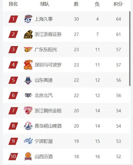 今天晚上的比赛结束后上海队和浙江广厦队依旧占据常规赛排行榜前二的位置,并且上海队(30胜4负)领先广厦队(27胜7负)3个胜场,本赛季已经基本确定可以拿到常规赛战绩第一。广厦队虽然二连败,但是依旧领先广东队和深圳队4个胜场,常规赛排名第二的位置也很稳健。广东队和深圳队目前都是23胜11负,其中三连胜的广东队暂时排在常规赛第3的位置;而深圳队则是拿到了一波九连胜,本赛季首次进入常规赛前四。