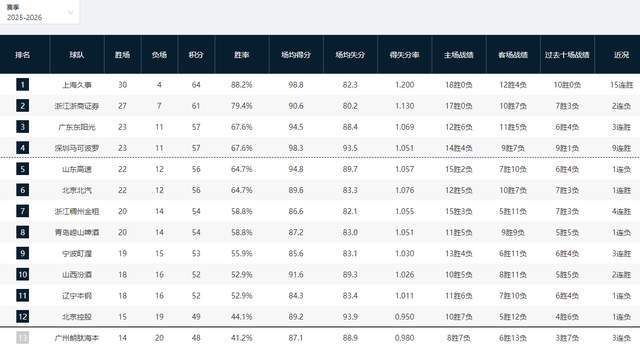CBA常规赛第34轮已经全部打完,在今晚结束的五场较量中,宁波男篮主场96-66大胜山东男篮,广东男篮主场100-80大胜浙江广厦,南京同曦主场99-96险胜江苏男篮,深圳男篮客场104-103险胜北控男篮,山西男篮客场102-86大胜新疆男篮。经过这轮精彩厮杀之后,积分榜排名又被重新打乱了,上海男篮15连胜稳居第一,浙江广厦两连败排名第二,广东反超北京杀回第三,深圳男篮九连胜排名第四,宁波男篮吊打山东排名第九,辽宁男篮陷入绝境排名第十一。