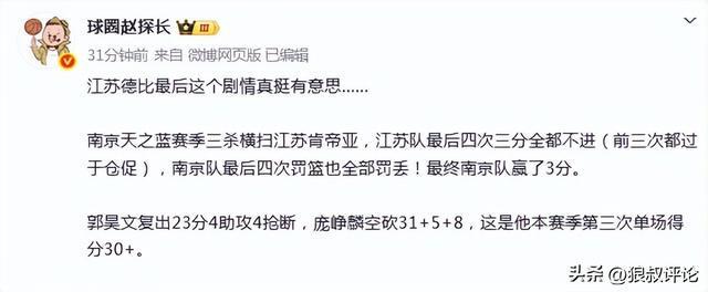 南京天之蓝赛季三杀横扫江苏肯帝亚,江苏队最后四次三分全都不进(前三次都过于仓促),南京队最后四次罚篮也全部罚丢!最终南京队赢了3分。