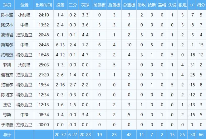 本场比赛,山东队刷新了多项耻辱纪录,面对宁波的13连胜被终结,66分为赛季单场最低分,30分的分差也是本赛季最惨痛的一场失利。山东队只有斯蒂尔表现出色,全场得到15分10篮板5抢断的两双数据,他在场时,全队仅仅输了1分。约翰逊虽然得到12分4篮板3助攻,但出现了多达5次失误,正负值为-18。其他队员无人得分上双,珀塞尔和琼斯的正负值均为-15,谢智杰-25,郭凯更是达到了惊人的-31。