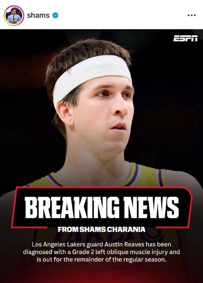 名记Shams报道,里夫斯被诊断为左侧腹斜肌二级拉伤,将缺席本赛季剩余常规赛比赛。