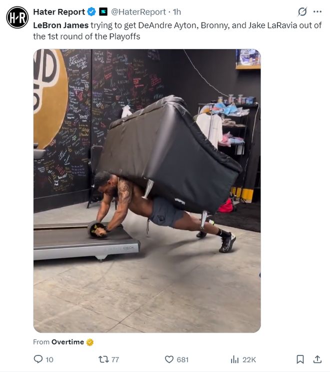 美媒HR:勒布朗将要带着艾顿、布朗尼、拉拉维亚这些球员一个人打季后赛首轮。(下图就是詹姆斯在季后赛首轮的现实反应,一个人扛下所有)