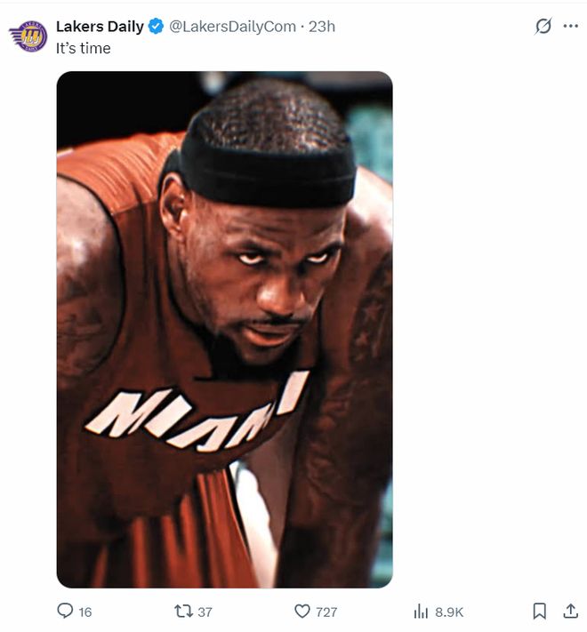 湖媒Lakers Daily晒出詹姆斯死亡之瞳的经典一幕写道:是时候了。