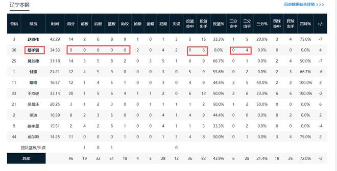 本场比赛,辽宁有10人上场,9人得分,其中6人得分上双,唯一名队员不得分,打了34分钟几乎所有数据栏都挂0,真是糟糕透顶。没错,这位队员就是首发的鄢手骐,他打了全队第二多时间,却交出惨不忍睹的数据,全场6投0中,一分不得,不但不得分,还0板0助,还有2个失误和4次犯规,这样的控卫也实在太差了,如果这场比赛不让他打这么多时间,也许胜利就在辽宁队一边。