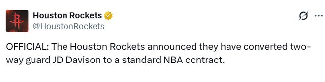 北京时间4月8日,火箭队官方今日宣布,将双向合同后卫JD-戴维森的合同转为标准NBA正式合同。据此前报道,双方签下的是一份两年合同,第二年是球队选项。火箭季后赛15人名单敲定,杜兰特申京将率队冲冠。