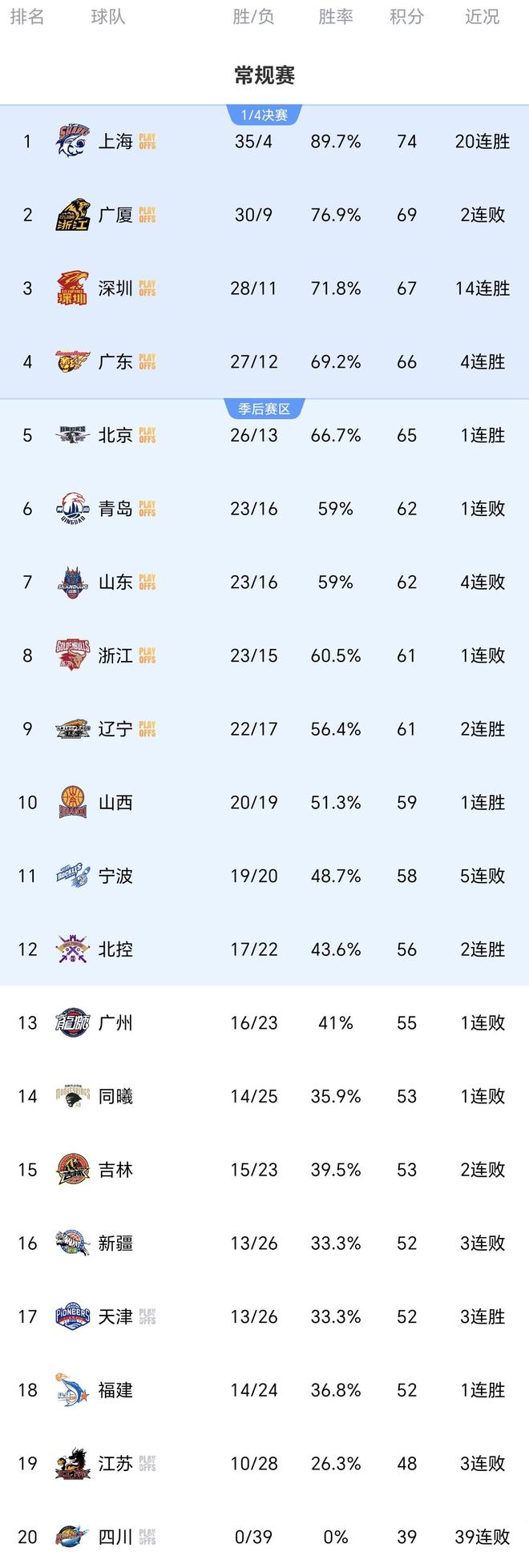 上赛季常规赛排名,广厦队第一、山西队第二,到了本赛季,广厦队基本锁定第二,山西队却掉到十名开外,还没有锁定季后赛席位。