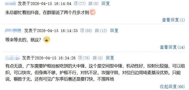 “有点无语,广东需要护框抢板吃饼的大中锋,这个是空间型中锋,机动性好,投射比较强,可以组织,可以快攻,但身高不够,护框不行,对抗不足,攻强守弱,对位白边周琦麦基没优势。只能说,聊胜于无,还有可见广东季后赛还是要打快,不落阵地。”