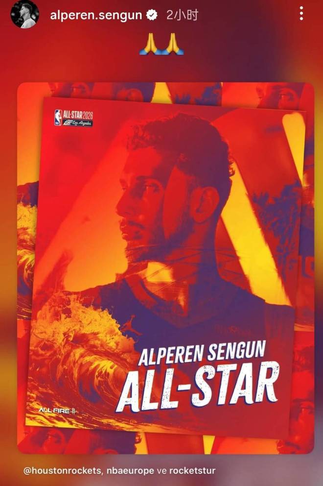 申京本人在IG社媒上晒出了入选全明星的海报,配上两个双手合十的表情,显然是对这次入选非常感恩。火箭队友杜兰特也晒出了同样的海报,配文写道:“祝贺28号申京,两次(入选全明星)了,未来还会有更多次!”