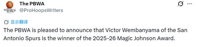 北京时间4月17日,美国职业篮球作家协会今日宣布,圣安东尼奥马刺队的维克托-文班亚马斩获2025-26赛季魔术师约翰逊奖。该奖项旨在表彰赛场表现出众,同时在对接媒体、对待球迷时兼具配合度与优雅风度的NBA球员。