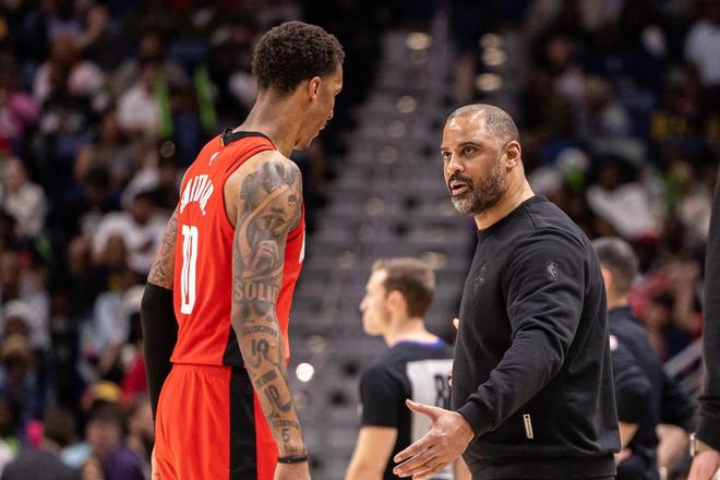 伊森手感不错,如果让他去出任小前锋代替杜兰特,让阿门·汤普森回到1号位,让火箭队的后场体型变大变高,可能更有利于火箭队的攻防。总之,火箭队让谢泼德首发,显然在本场比赛里证明是不成功的。要么让伊森首发,要么就看看杜兰特下一场能不能回来,这是火箭队提升首发阵容的最佳方案。