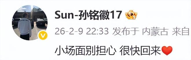 当球迷都在担忧的时候,孙铭徽在社交网站上公布了动态,他表示:小场面别担心 很快回来。这样的话语出来之后球迷都放心了。至少他不会赛季报销,而且未来这一个月还是窗口期,就是全明星应该是不能打了。并且现在距离季后赛还有三个月的时间,这样的长度已经足够了。如果按照孙铭徽的话语来说,基本上两个月就能复出?球迷也可以好好期待下,不知道广厦官方会不会公布伤情。