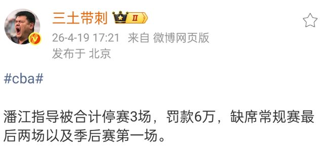 本赛季的山西男篮可以说是一言难尽,特别是主帅潘江被球迷诟病,然而就在常规赛结束阶段,潘江却收到了罚单,由于在山西男篮客场和江苏男篮的比赛中辱骂裁判,潘江被禁赛3场,也就是说,附加赛第一场潘江也会缺席。
