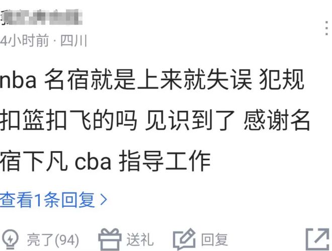 看到崔永熙迟迟没有打出身价,赛后又有不少球迷对他展开了嘲讽:NBA名宿上来就失误、犯规,扣篮扣飞的吗?CBA篮筐质量不行,要是NBA篮筐这球就进了。