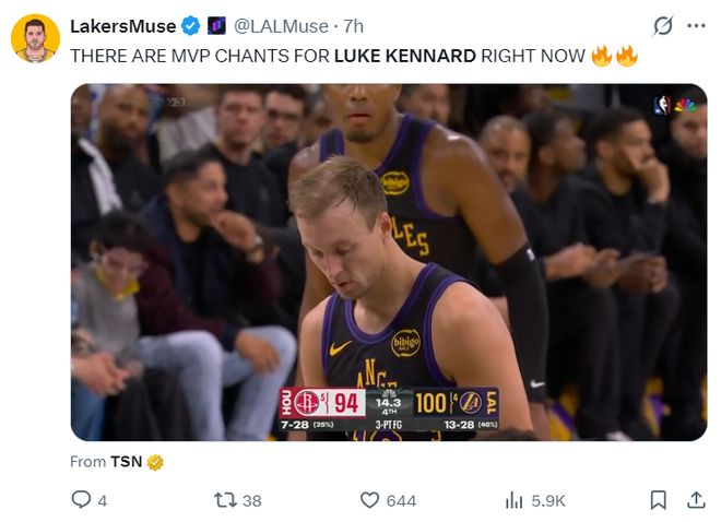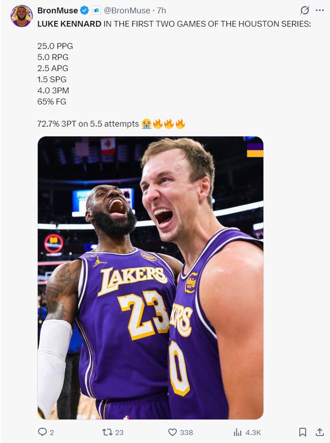 湖人主场连续两场比赛击败火箭队,不管有没有杜兰特火箭都不是湖人对手,勒布朗的个人能力还是那么无解,阿门、伊森、杜兰特、泰特都无法限制他,可最让人意外的那个却是顶替东契奇打先发一号位的肯纳德。