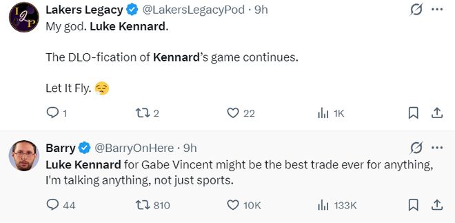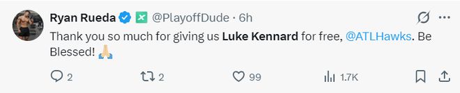 湖人记者Ryan Rueda致谢老鹰,他写道:非常感谢亚特兰大老鹰交肯纳德送给我们。保佑老鹰队吧。