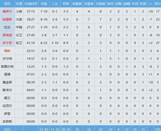21届状元郎坎宁安投篮23中8贡献27分5板9助同时出现9次失误;内线核心杜伦投篮10中3,仅拿下8分9板准两双,唯一亮眼的就5帽数据。