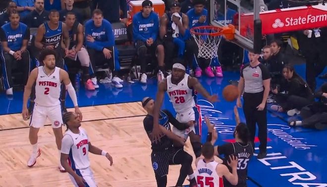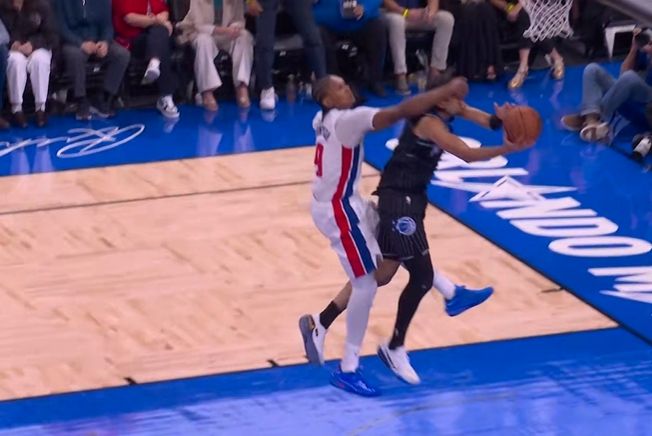 奥萨尔-汤普森追防,直接打到布莱克头上,被吹一级恶意犯规。