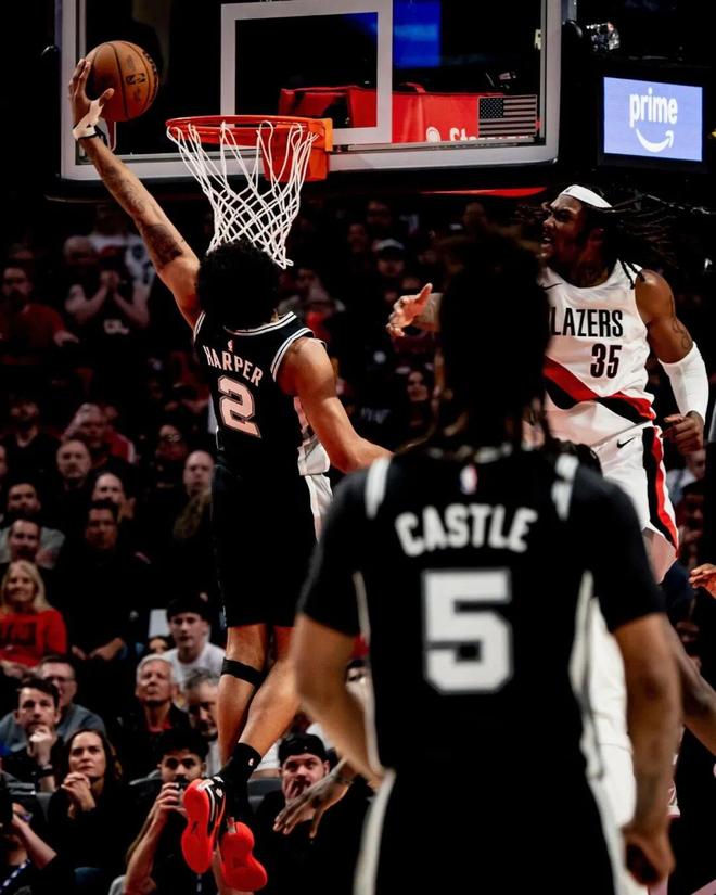 在被马刺选中的那一刻开始,他的成长环境就已经不同于很多高顺位新秀——并非说马刺环境不好,相反的,马刺是最会培养新秀的球队之一,但你必须承认,有文班亚马,有卡斯尔,有福克斯,哈珀得到的机会比较有限,根本无法像弗拉格那样大展手脚,甚至连首发都不是。