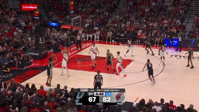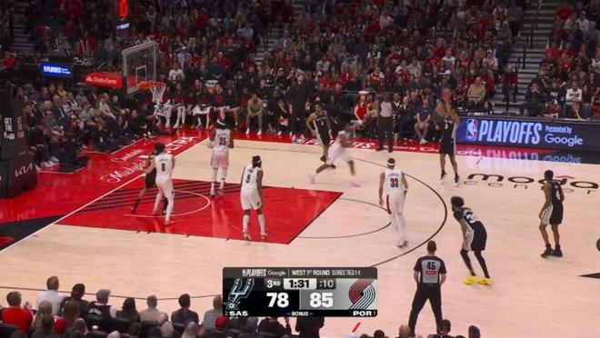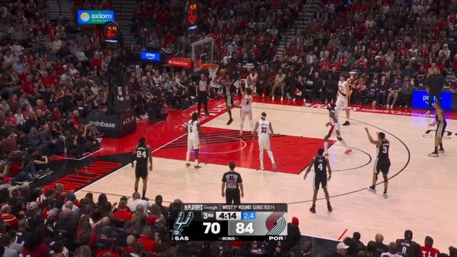 第三节剩下7分钟前,马刺一度64-77落后开拓者,然后哈珀被派上场,并且改变了场上局势:
