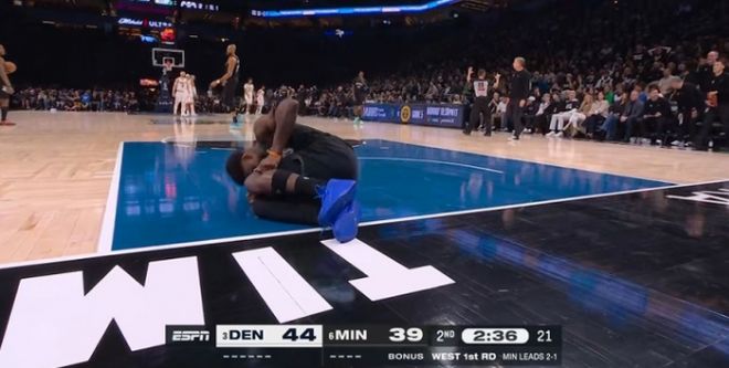北京时间4月26日,NBA季后赛首轮G4森林狼继续坐镇主场迎战掘金,继迪文琴佐开局79秒受伤退赛后,在上半场结束前2分36秒,爱德华兹飞身想要封盖,结果落地时膝盖受伤痛苦打滚,随后爱德华兹也是被搀扶回更衣室。