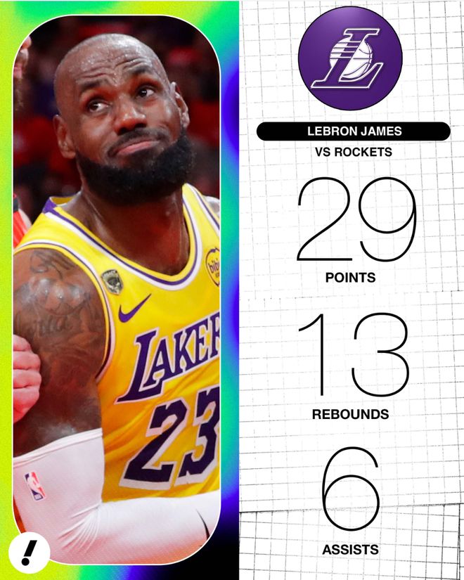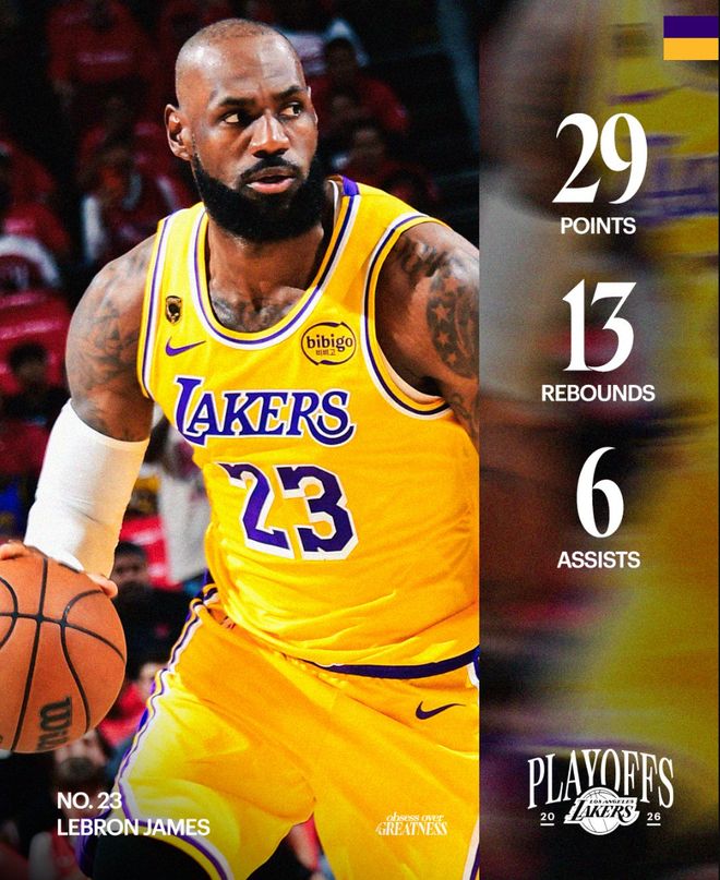 湖人首轮已经3-0领先火箭,这场比赛41岁的勒布朗鏖战45分钟,22中10,三分9中4,罚球6中5,拿到29分13篮板6助攻3抢断1盖帽,命中率45.5%,三分命中率44.4%,真实命中率58.8%,美中不足是有8个失误。