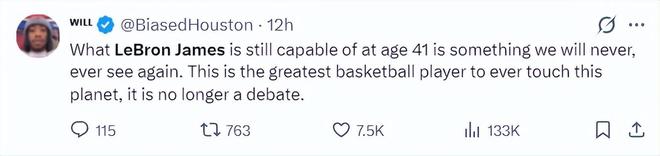 休媒Will都被詹姆斯打服了,他写道:41岁的勒布朗在这个年纪依旧能展示非凡的水准,这是我们未来再也无法看到的了,他就是这个星球上最伟大的篮球运动员,这一点毋庸置疑。