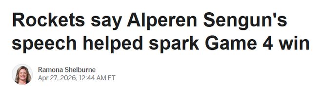 北京时间4月27日,火箭115-96击败湖人,将总比分扳成1-3,避免了被横扫的结局。ESPN揭秘火箭本场大胜,特别提到了申京赛前的讲话,鼓舞了火箭全队的士气。