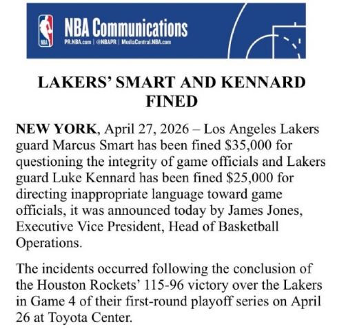 北京时间4月28日,NBA官方公布在火湖首轮G4比赛,斯马特因为质疑裁判公正性,被罚款3.5万美元。至于肯纳德因对裁判使用不当言论,被罚款2.5万美元。