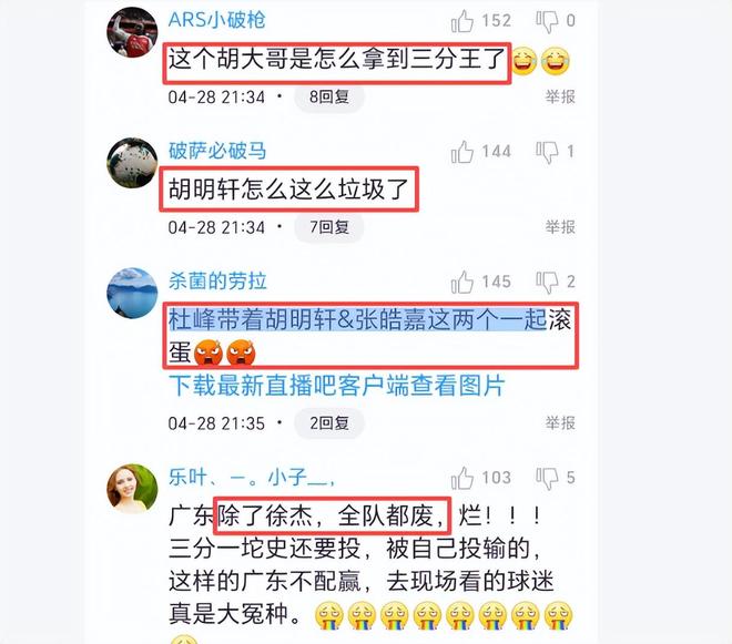 胡明轩和张皓嘉两人共得0分,还有5次犯规,可以说在攻防两端都不中用,反而拖了全队的后腿。赛后球迷说,“除了徐杰,全队都废了”、“这个胡大哥是怎么拿到三分大赛冠军的?”、“希望杜锋带着胡明轩&张皓嘉这两个一起离开广东队”。老实讲,杜锋今天就不应该让胡明轩和张皓嘉进入比赛名单。若让陈家政进入名单多好。诸位,你们说呢?