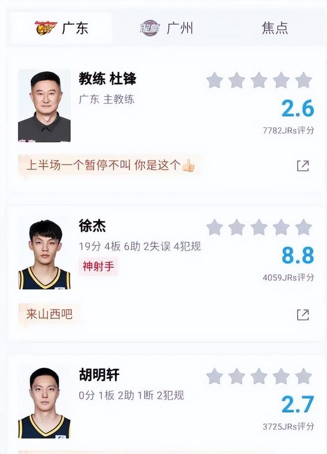 这场比赛结束后,有超过5.3万的球迷对两队球员进行了评分,广东男篮方面除了徐杰外,其他球员的评分都比较低,基本上只有三四分左右。其中有四人的评分低于三分,分别是主教练杜锋的评分只有2.6分,胡明轩的评分是2.7分,张皓嘉的评分是2.5分,萨林杰的评分是2.9分,这些评分足以说明了广东球迷对他们的不满。输掉这场比赛后,无论是杜锋还是广东男篮全队,都需要好好总结了,必须要打好下一场比赛,否则就只能止步季后赛了。