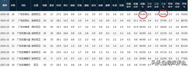 35.8%的投篮命中率为生涯最低,比新秀时期的37.4%还低一个档次,而三分球投篮命中率为30.8%,则是生涯倒数第三,仅次于生涯前两个赛季。