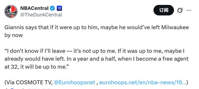 此前在接受ESPN采访时,字母哥曾表示不希望任何人觉得自己抛弃雄鹿,但他也无法接受留下却再也不能夺冠。