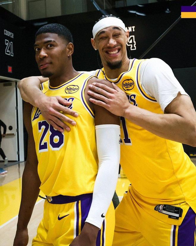 从湖人官方更新的花絮照片来看,东契奇把带有自己名字的卡片贴在额头上,显得非常另类,他的身边是海斯,笑得很憨厚。克勒贝尔摸着自己的胡子在耍帅,身后的布朗尼已经笑得不行了。