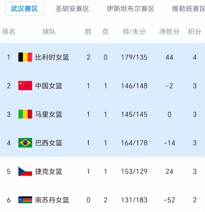 从积分榜来看,除了比利时之外,小组其他球队全部输过比赛,中国女篮、巴西、马里、捷克四支球队均为1胜1负,只有南苏丹遭遇两连败。