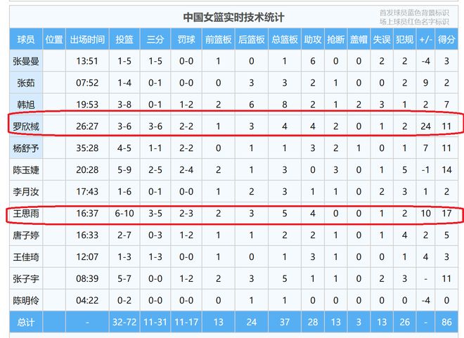 俗话说,数据不会说谎,从罗欣棫、王思雨的个人数据,正负值,就充分说明,她们的表现对球队的帮助巨大,是球队的赢球的最大功臣。