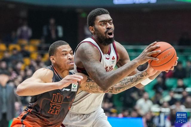 3月16日,山东高速队球员克里斯(上)在比赛中防守。新华社记者 朱峥 摄