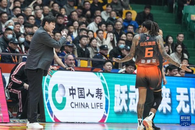 3月16日,山东高速队主教练邱彪(左)在比赛中和队员珀塞尔交流。新华社记者 朱峥 摄