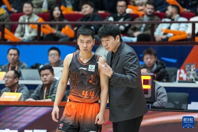 3月16日,山东高速队球员陈培东(左)和主教练邱彪在比赛中交流。新华社记者 朱峥 摄