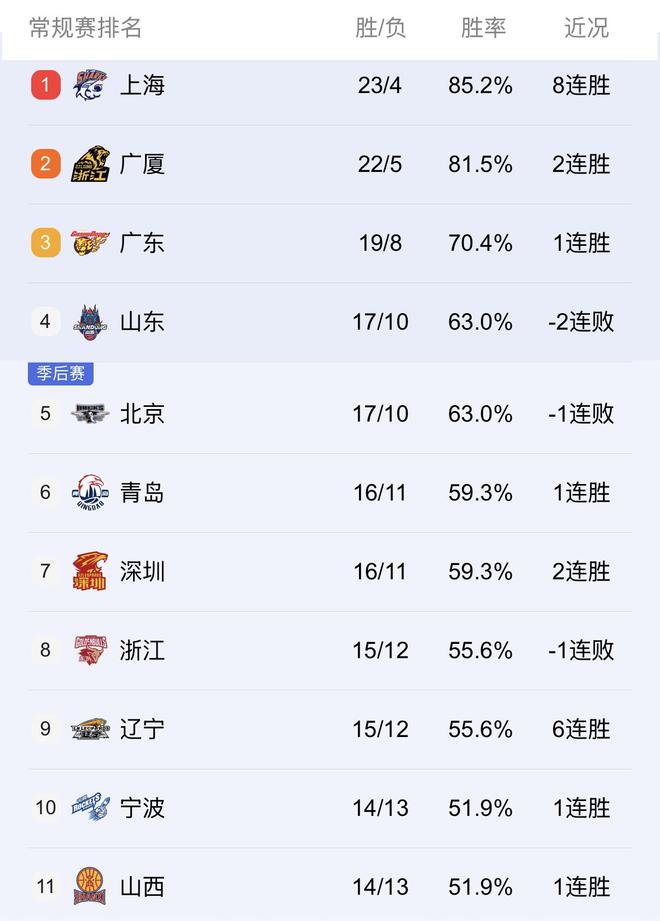 今晚两场比赛打完后,CBA第27轮也全部结束了,本赛季已到了冲刺阶段,从联赛积分榜来看,上海拿到常规赛冠军的可能性很高,浙江广厦因为频繁遭遇伤病问题稳住第二没有问题,广东宏远虽然现在还排在第三,但后面要打的强队太多,加上自己实力不稳,常规赛结束是否能留在四强都成问题。山东、北京、青岛、深圳、浙江和辽篮,乃至宁波和山西,第4到第11名之间的差距并不大,随着联赛赛程的深入,谁冲出来都有可能。按照最近各队的情况来看,换帅后脱胎换骨的辽篮凭借赛程优势,甚至有可能冲进前五甚至是四强!