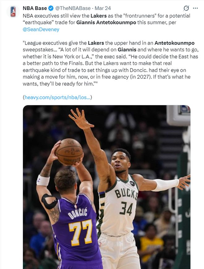 一位匿名的高管透露,如果扬尼斯留在东部进入总决赛的道路会更平坦,但湖人希望推动这笔重磅交易,让两位欧洲巨星齐聚洛杉矶。当然,湖人也有可能将这笔引援留到2027年夏,那时候湖人可以直接签下扬尼斯而非交易。