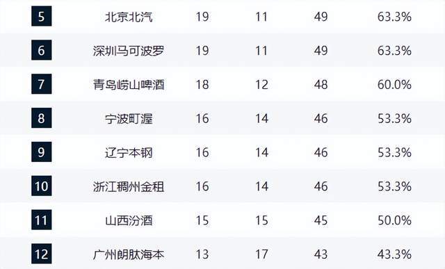 青岛队以18胜12负升至第7,宁波、辽宁、浙江三队同为16胜14负,形成激烈缠斗的“16胜集团”。山西队15胜15负,勉强站上胜率50%线。广州队与北控、吉林队同为13胜17负,分列第12至14名,成为季后赛边缘球队。其中广州凭借小分优势暂居“守门员”位置,但随时可能被反超。