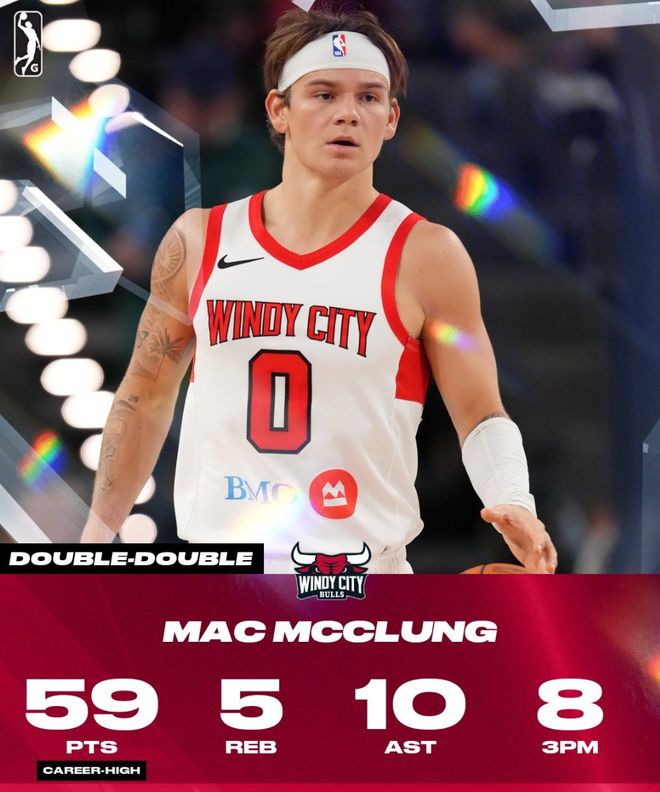 昨天在NBA发展联盟,身披公牛下属球队球衣的麦克朗面对鹈鹕的“小号”伯明翰中队,出战42分钟,34投19中狂轰59分10助攻5篮板,在三分线外17投8中。
