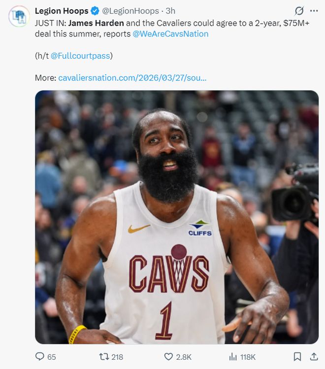 赛前就传来一个好消息,哈登将拒绝执行26-27赛季4231万的球员选项(仅保障1330万),他将与骑士达成一份全新两年超过7500万的续约合同,第二年是球员选项。