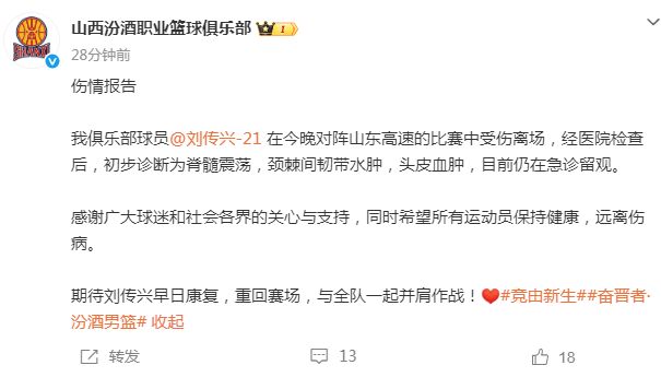 刘传兴在对阵山东男篮的比赛中受伤离场,经医院检查后,初步诊断为脊髓震荡,颈棘间韧带水肿,头皮血肿,目前仍在急诊留观。