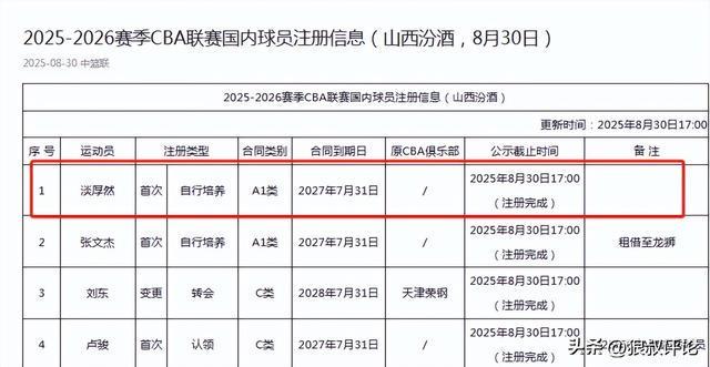 去年CBA上报国内球员注册信息的时间段,山西男篮就为淡厚然进行了注册,与曾凡博不一样的是并不是预注册的方式,而是直接以自行培养的方式进入注册信息表,提交到CBA公司审核。