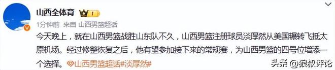 山西男篮注册球员淡厚然从美国辗转飞抵太原机场。经过休整恢复之后,他有望参加接下来的常规赛,为山西男篮的四号位增添一个选择。