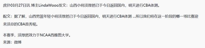 2026年3月27日山西拿下山东,赛后还迎来了一个利好消息,那就是淡厚然居然回国了。因为根据目前曝光的消息:淡厚然已于今日返回国内,明天进行CBA体测。如果明天过体测的话,可能接下来也快迎来首秀了?