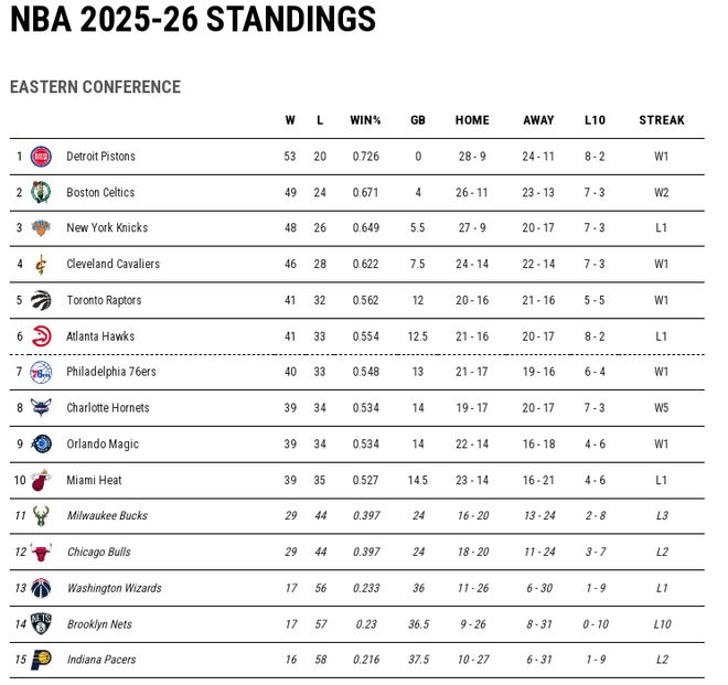 东部目前活塞稳居榜首,前四名的球队相对清晰,东部前六直通名额依然存在悬念。